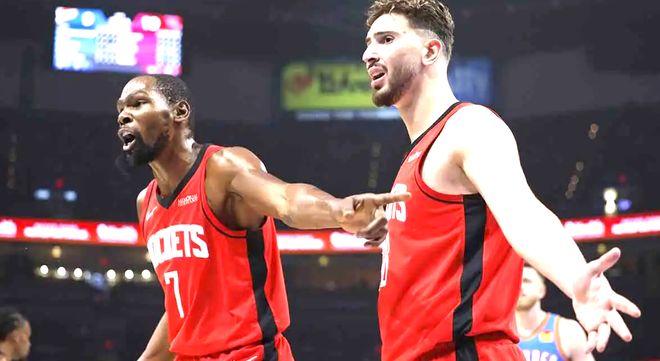 杜蘭特的個人能力從未讓人失望。對陣活塞一役,他全場轟下37分3籃板1助攻3搶斷,三分命中率42.9%、罰球命中率87.5%,用無差別得分能力一次次撕開對手防線;對陣雷霆,他也拿下23分9籃板,在加時賽中多次關鍵得分試圖挽救球隊。兩場比賽,他場均30分的輸出,放在聯(lián)盟歷史上也能排進開局表現(xiàn)前十,可這樣的統(tǒng)治級得分,卻沒能給火箭帶來一場勝利——問題的根源究竟在哪里呢?