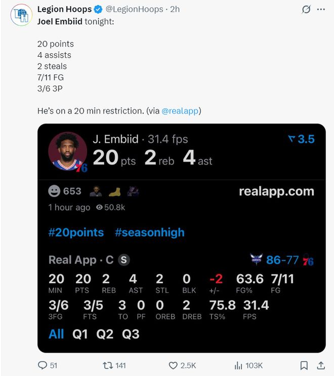 北京時(shí)間10月26日,費(fèi)城76人125-121險(xiǎn)勝夏洛特黃蜂,這場(chǎng)比賽兩隊(duì)是拉鋸戰(zhàn),首節(jié)費(fèi)城領(lǐng)先7分,但第三節(jié)黃蜂反超后拉開到11分,憑借費(fèi)城眾將末節(jié)的表現(xiàn)艱難過關(guān)。此役費(fèi)城的核心喬爾-恩比德僅僅打了20分鐘。